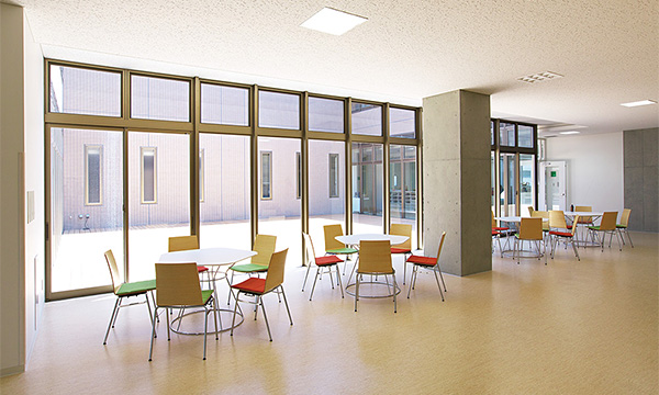 - 光の庭に面した明るいホールは、空き時間の自習や、ランチタイムに使っています。